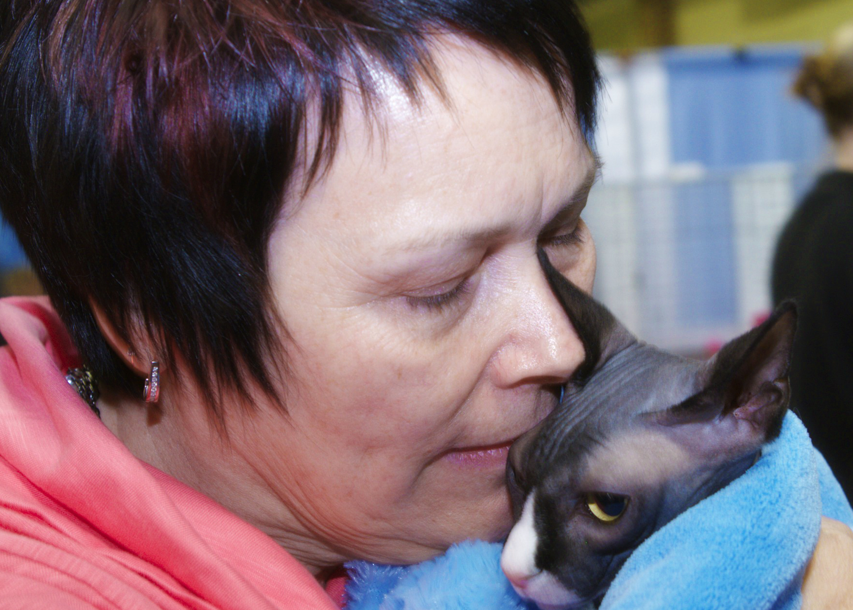 Ethel and Jaxx were at the Calgary Cat Show (his first) with Jaxx’s breeder, Dawn Magrath (of Coulee Sphynx, in Lethbridge); she was showing his sister, Lily. Ethel has wanted a Sphynx cat for 32 years! She finally found Dawn and bought Jaxx, her first cat, last year. Her dream finally came true! When I met them at the Show, Jaxx had just won 10th place in Best of All Breed, Altered. He is a very friendly fellow, I found him very warm to touch, his skin so soft, like a shammy cloth.